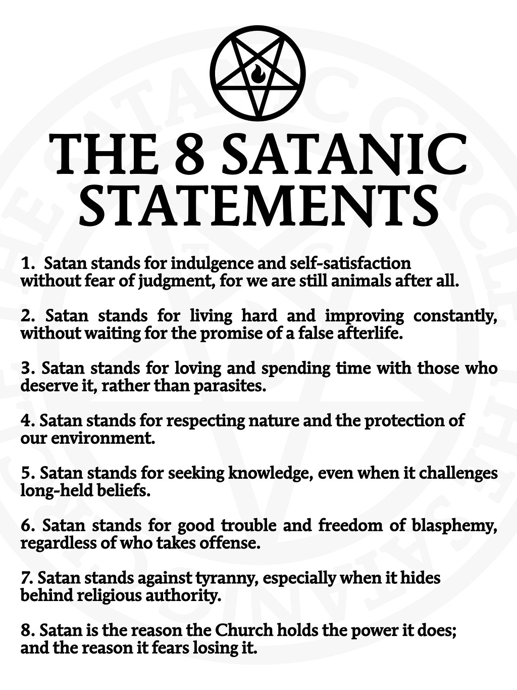 The 8 Satanic Statements are statements on how we interpret the symbol of Satan in our movement and religion.